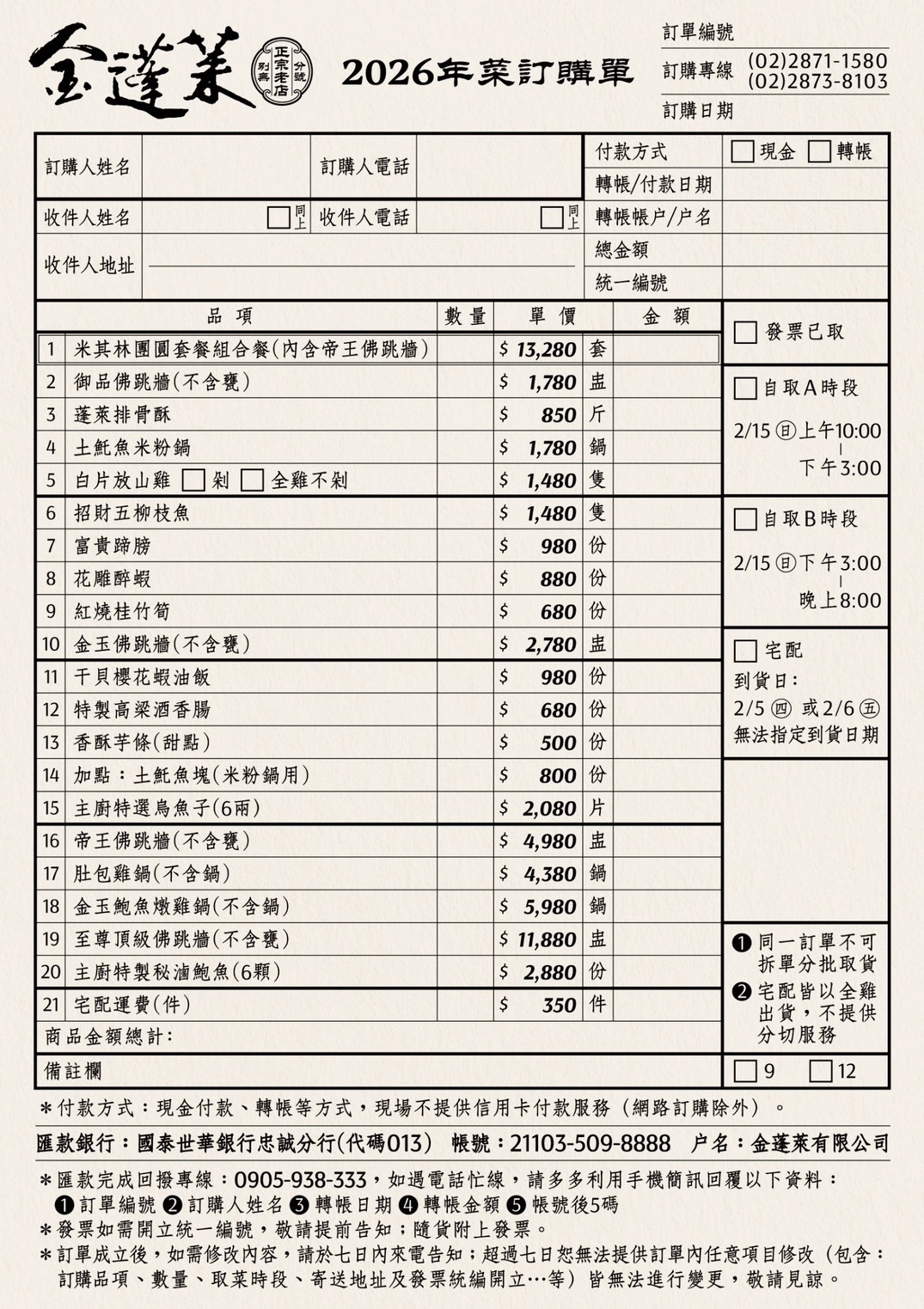 2026年金蓬萊米其林一星年菜DM &訂購說明